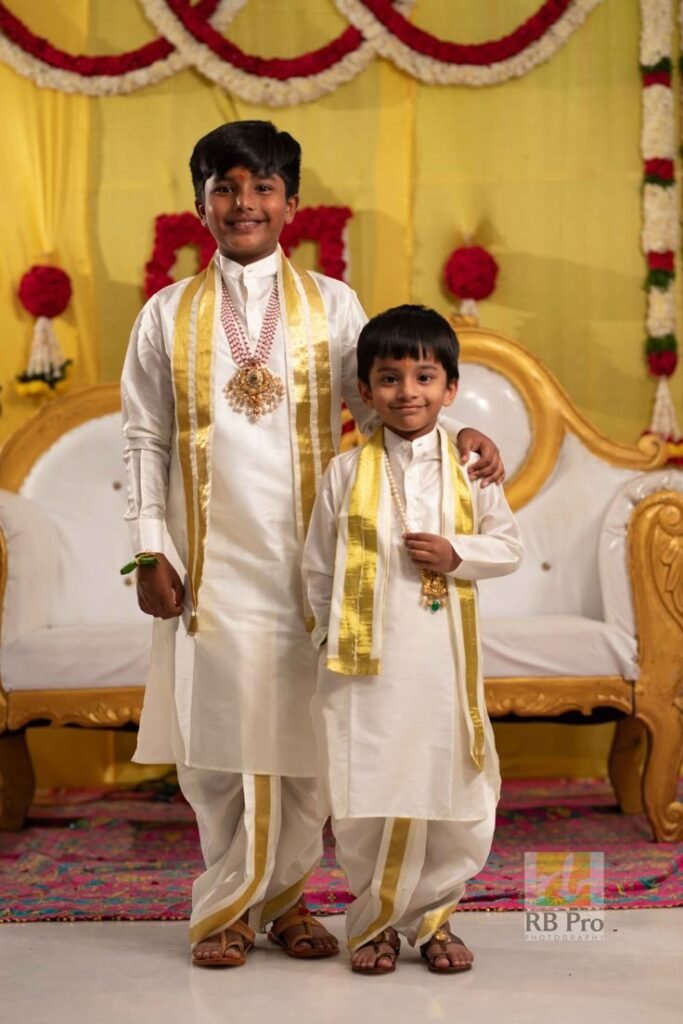 First time wearing dhothi, symbol of purity, discipline, and cultural values.